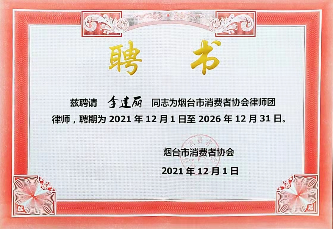 | 瀛伟动态 | 李建丽主任连续两届受聘为烟台市消费者协会律师团律师 |