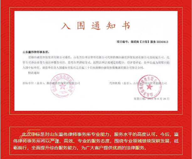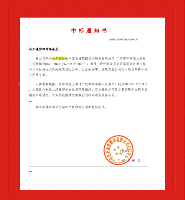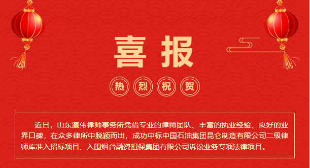 瀛伟喜报|瀛伟律所成功中标中国石油集团昆仑制造有限公司、烟台融资担保集团有限公司两大法律服务项目