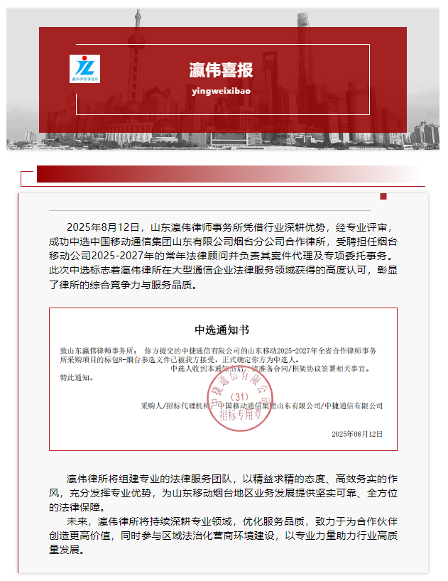 瀛伟喜报|专业力量再获认可!瀛伟律所成功中选烟台移动公司合作律所