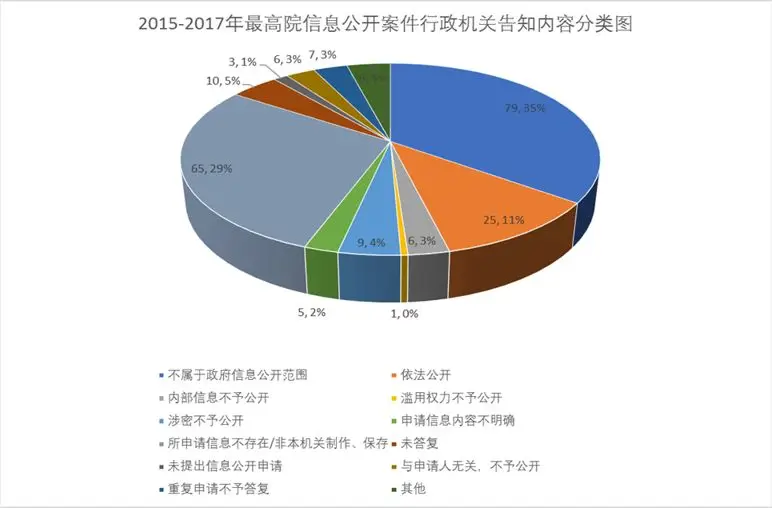 2015-2017年(1-9月)最高院涉及信息公开的案件中,再审申请人均为原信息公开申请人,包含法人和自然人,其中再审申请人为自然人的有224例,再审申请人为法人单位的只有1例,可见,自然人是申请政府信息公开的绝对主力军。行政机关均未提起再审申请,在再审案件中全部作为再审被申请人。 六、2015-2017年(1-9月)最高院信息公开案件行政机关告知内容分类