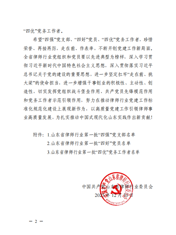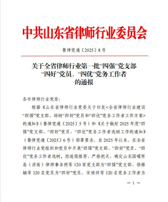 近日,中共山东省律师行业委员会印发《关于全省律师行业第一批“四强”党支部、“四好”党员、“四优”党务工作者的通报》,对全省律师行业党建工作中涌现的先进典型予以通报表扬。中共山东瀛伟律师事务所支部委员会光荣入选,获评山东省律师行业第一批“四强”党支部! 瀛伟律所党支部自2002年成立以来,始终秉持“党建为纲、统战为基、奉献为责”的理念,团结带领全所律师同心奋进,持续加强政治功能、支部班子、党员队伍和作用发挥等方面的建设,为律所高质量发展注入了坚实的“红色动力”。    瀛伟律所党支部始终将政治建设摆在首位,充分发挥“党建带所建”的核心作用,把党建工作深度融入律所管理、队伍建设、业务开拓及人才培养全过程。通过严格落实“三会一课”制度,持续开展“习近平法治思想”主题教育、“不忘初心、牢记使命”主题教育、党史学习教育、党纪学习教育等系列活动,不断筑牢党员律师的思想根基,确保律所发展始终沿着正确方向行稳致远。 瀛伟律所党支部结合律所实际,探索形成“一个堡垒、两条主线、三项措施”的“123工作法”,精心打造“党建为纲、统战为基、奉献为责”的特色党建品牌。通过推动党员律师与民主党派律师、青年律师深度融合、协同共进,有效提升了党支部的凝聚力和战斗力,实现了党建与所建、业务、人才发展的同频共振。 此次荣获“四强”党支部称号,是上级党委对瀛伟律所党建工作的高度肯定与有力鼓舞。展望未来,瀛伟律所党支部将继续以高标准推进基层党组织建设,持续发挥政治核心与战斗堡垒作用,团结引领全所人员为法治建设与社会发展贡献更多瀛伟力量! |